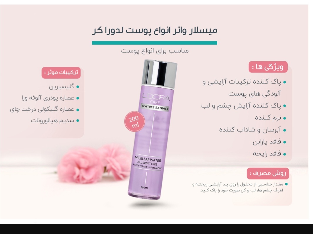 ترکیبات موثر: : گلیسیرین، عصاره پودری آلوئهورا، عصاره گلیکولی درخت چای، سدیم هیالورونات