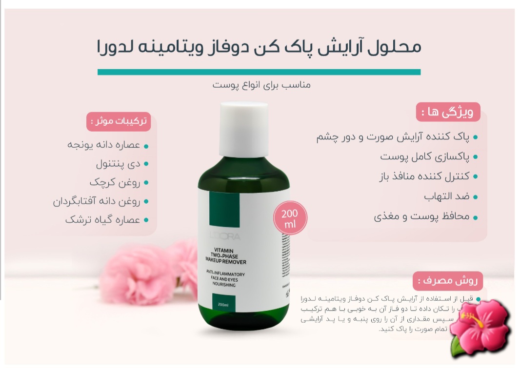 ویژگی ها: پاککننده آرایش صورت و دور چشم، پاکسازی کامل پوست، کنترلکننده منافذ باز، ضدالتهاب، محافظ پوست و مغذی