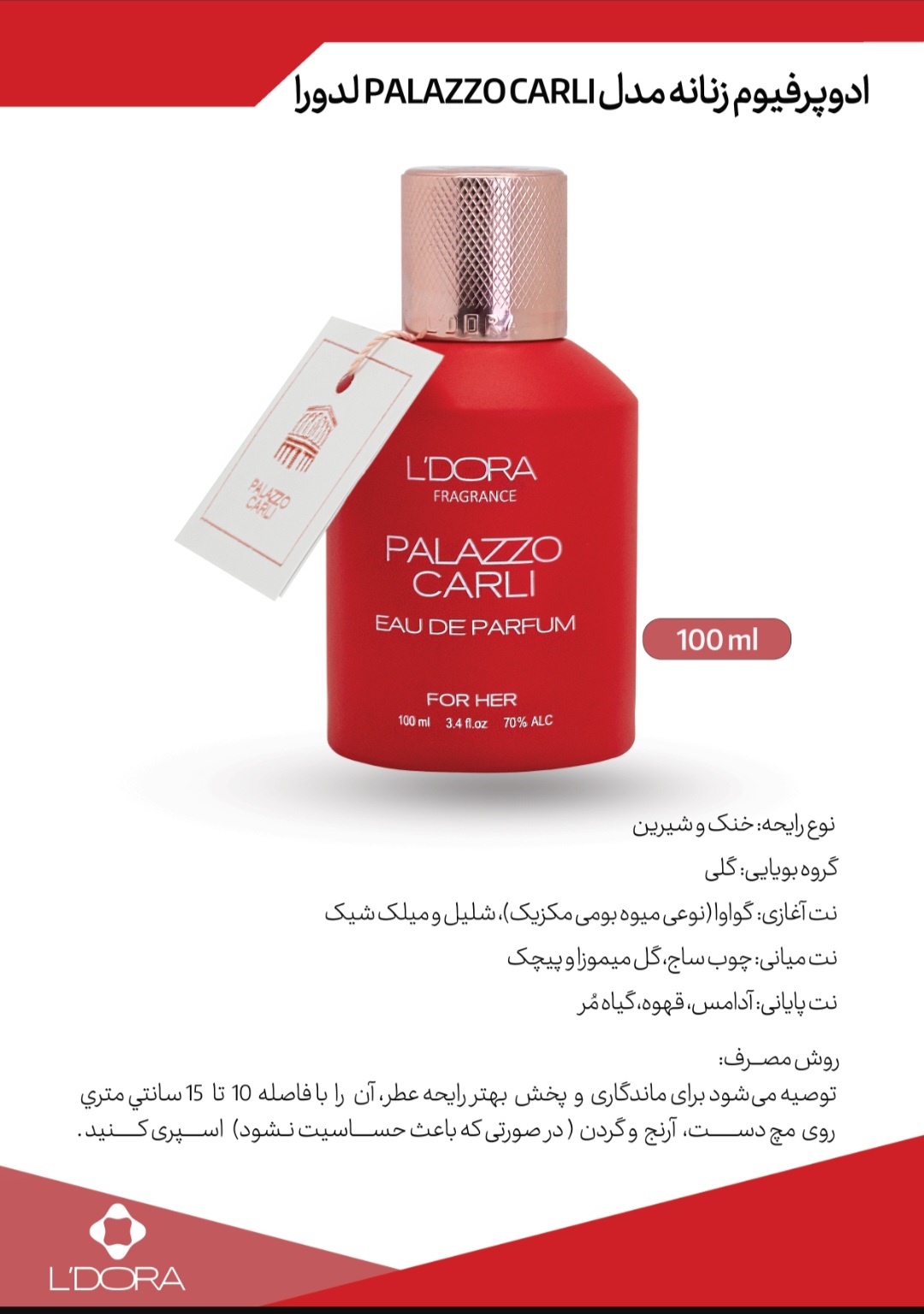 عطرهای لدورا فرگرنس که در حجم 100 میلیلیتر تولید و به بازار عرضه شده، کالکشن جدیدی با کیفیت مطلوب و ماندگاری بالا است که این مجموعه را در طبقهبندی عطرهای نیش قرار میدهد. در ادوپرفیوم های لدورا فرگرنس 100 میلیلیتر اسانسهای طبیعی متمایز و منحصر بهفرد فرانسوی، اسپانیایی و ایتالیایی و ... بهکار رفته است. این عطرها با توجه به سلایق مختلف در چندین رایحه زنانه، مردانه و اسپرت با طراحی جدید، متفاوت و بستهبندی شیک عرضه شده است.